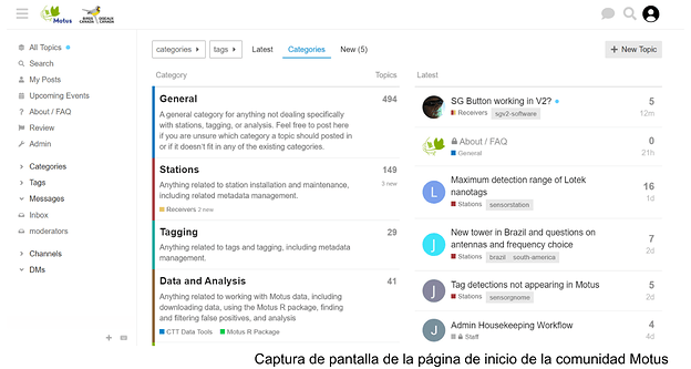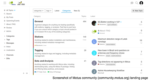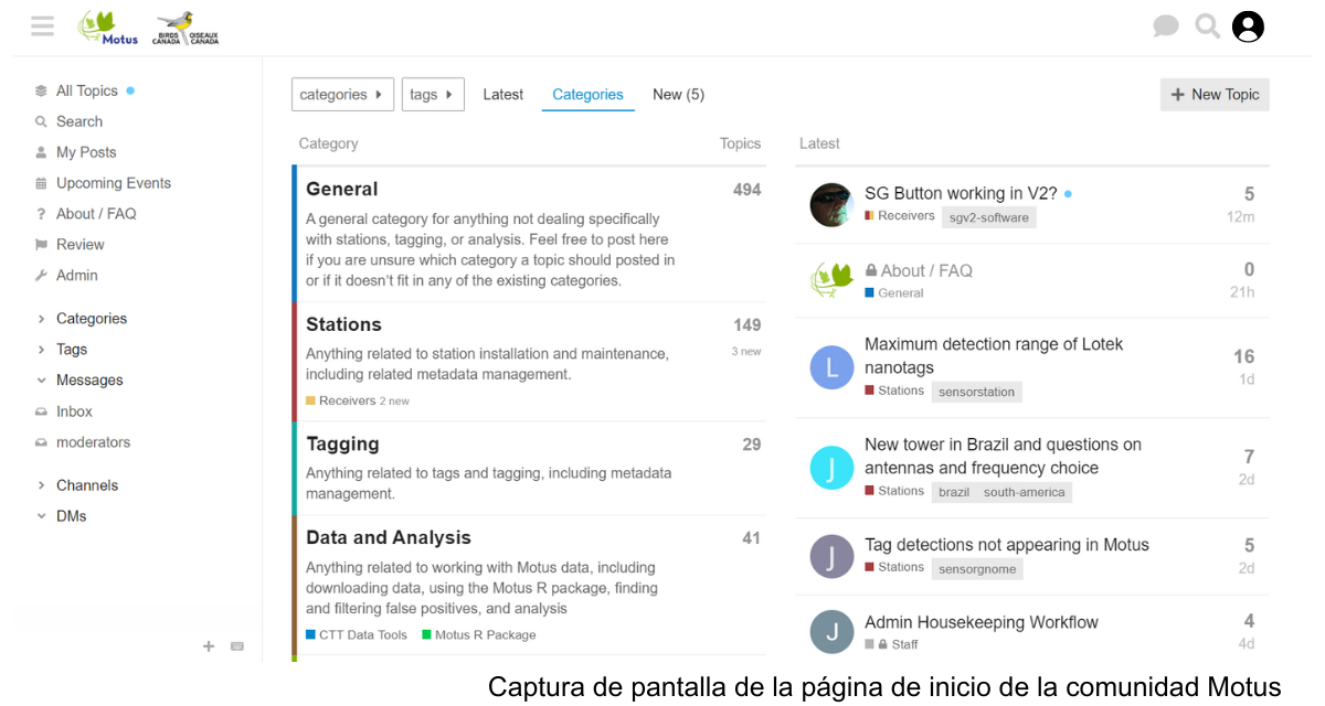 Echa un vistazo al nuevo foro de la Comunidad Motus. Aquí podemos aprovechar al máximo nuestra experiencia y recursos colectivos en un espacio de colaboración en línea. Este es un lugar para discutir todo lo relacionado con Motus: desde el diseño del estudio y las preguntas de investigación, hasta la instalación de la estación y el etiquetado, el análisis y el paquete R, y las aplicaciones de conservación.