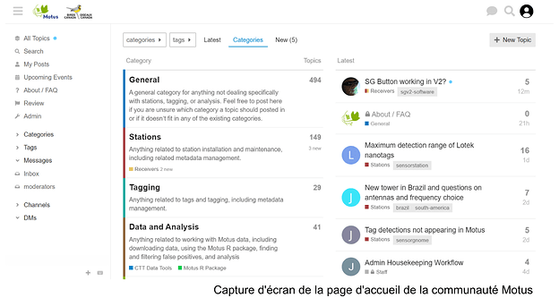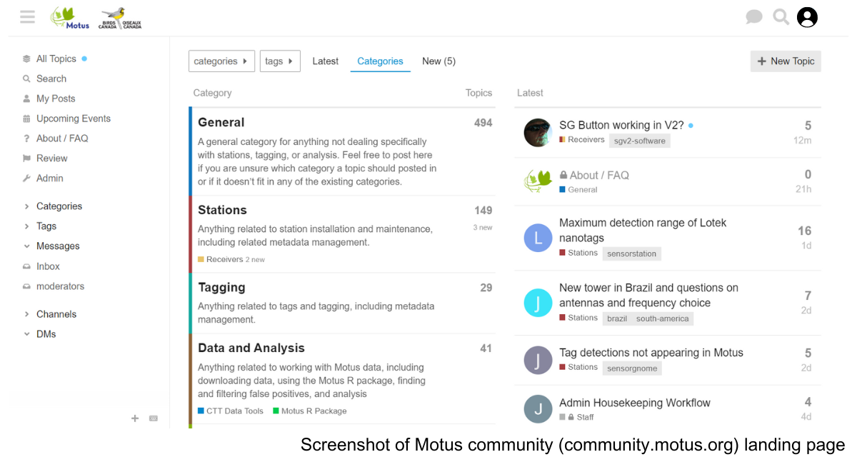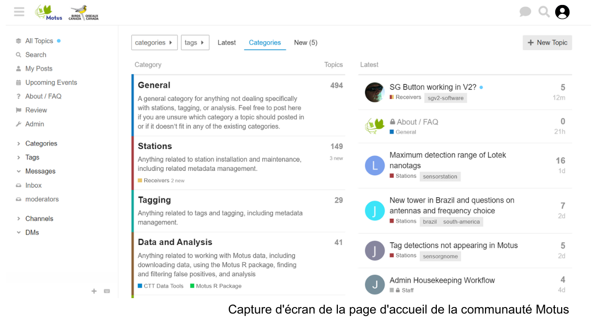 Jetez un coup d’œil au nouveau forum de la communauté Motus! Ici, nous pouvons tirer le meilleur parti de notre expertise collective et de nos ressources dans un espace collaboratif en ligne. C’est un endroit où l’on peut discuter de tout ce qui concerne Motus : de la conception de l’étude et des questions de recherche, à l’installation des stations et au marquage, en passant par l’analyse et le progiciel R, jusqu’aux applications de conservation.
