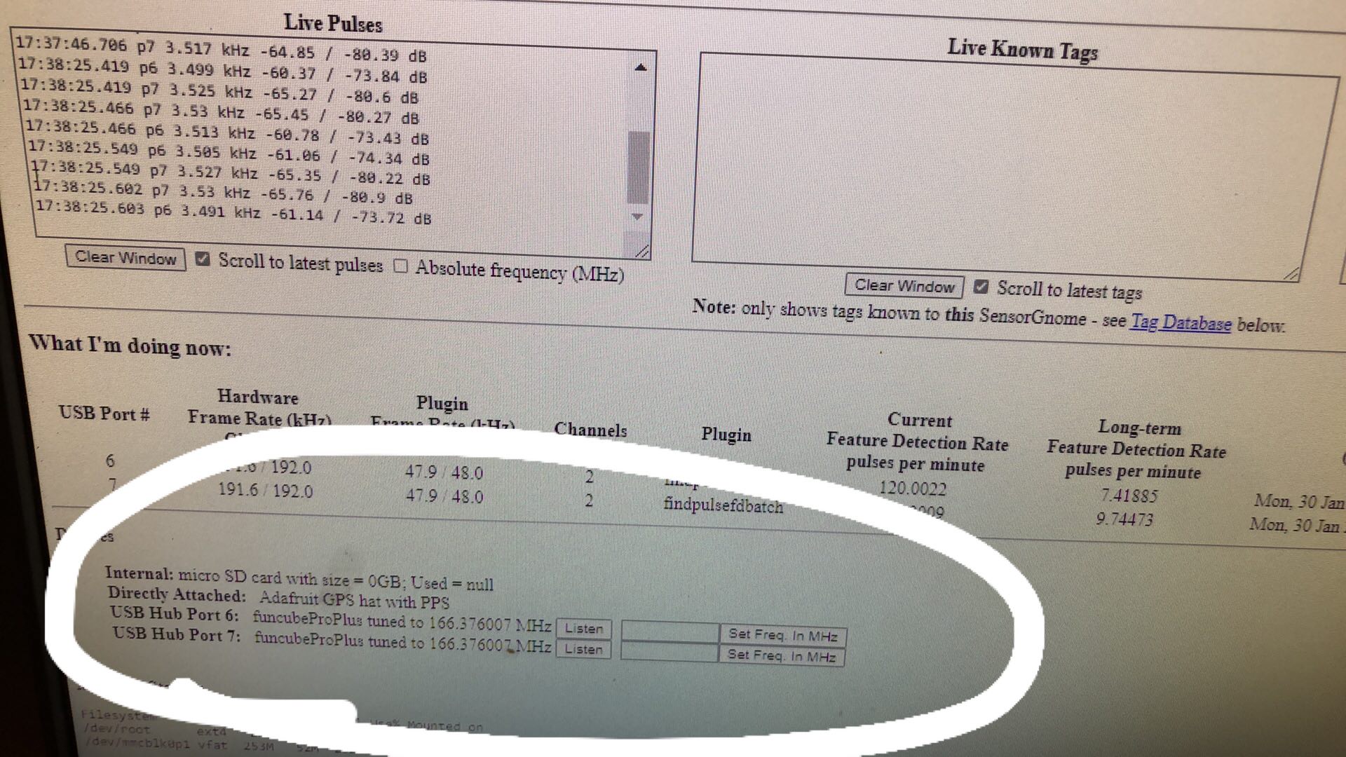 When we plug the sensor station into the computer, we can see some live pulses but no known live tags. This is likely because we haven’t uploaded a tag detection database to the funcubes but my understanding is that this shouldn’t affect detections showing up on Motus. I’ve attached a screenshot of the web interface and it looks like everything is as expected (I think).