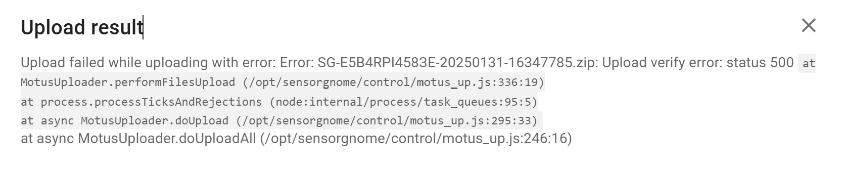 Apr 22 22:18:24 localhost sg-control[712]: Motus upload starting for SG-1550RPI4E470-20240421-e4997bab.zip with 48 files Apr 22 22:18:25 localhost sg-control[712]: Upload failed while uploading with error: Error: SG-1550RPI4E470-20240421-e4997bab.zip: Upload verify error: status 500