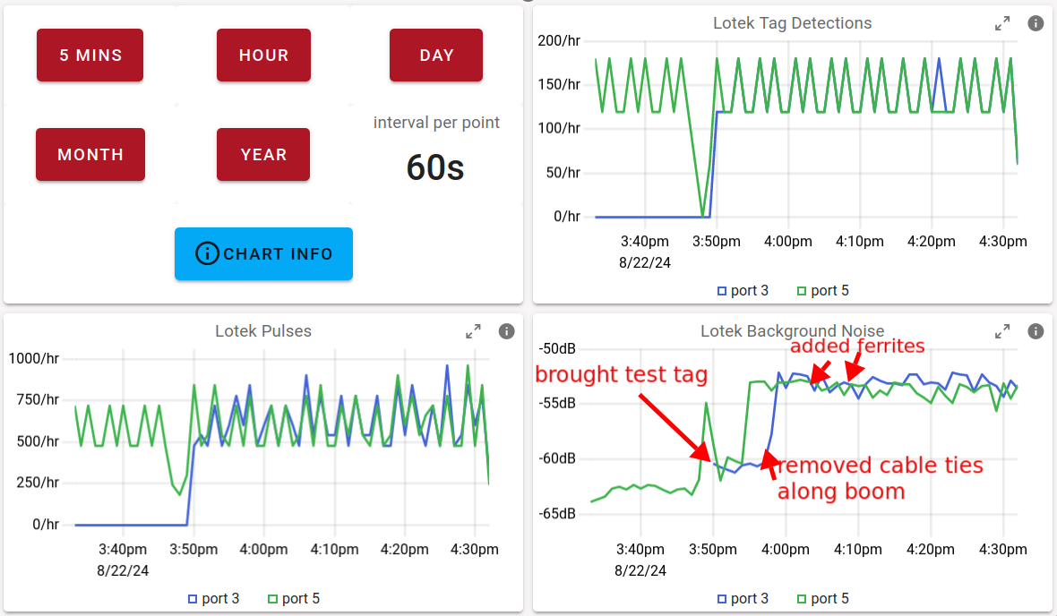 Performing short duration tests for Motus receiver site selection or antenna orientations may give a false impression in locations such a the Ankeny Hill site due to the periodic nature of non-Motus interference.