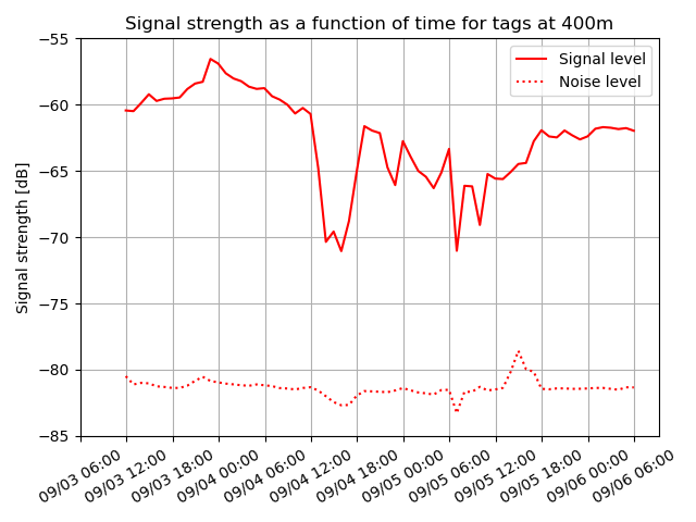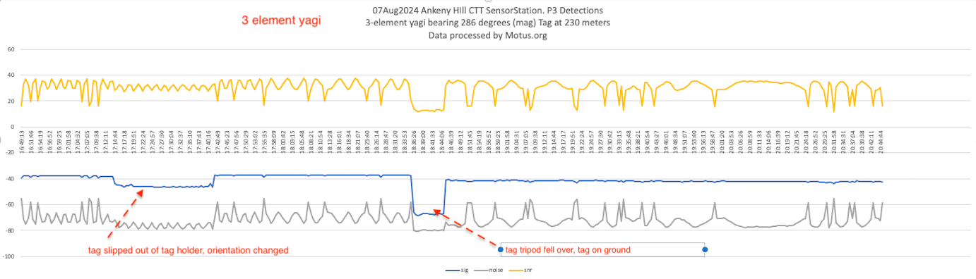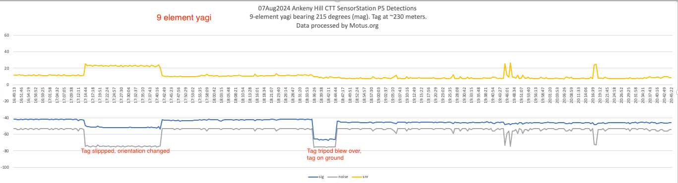 Motus.org processing detected the tag 279 times over the ~3.5 hours. There were several instances where I would expect to have missed detections (such as when the tag tripod got blown over or when I was connecting/disconnection the LNA-Filter). Overall there were only about 7 missed detections that could not be explained. Those missing detections appeared to be mostly during the periods when the highest numbers non-motus hits were being received.