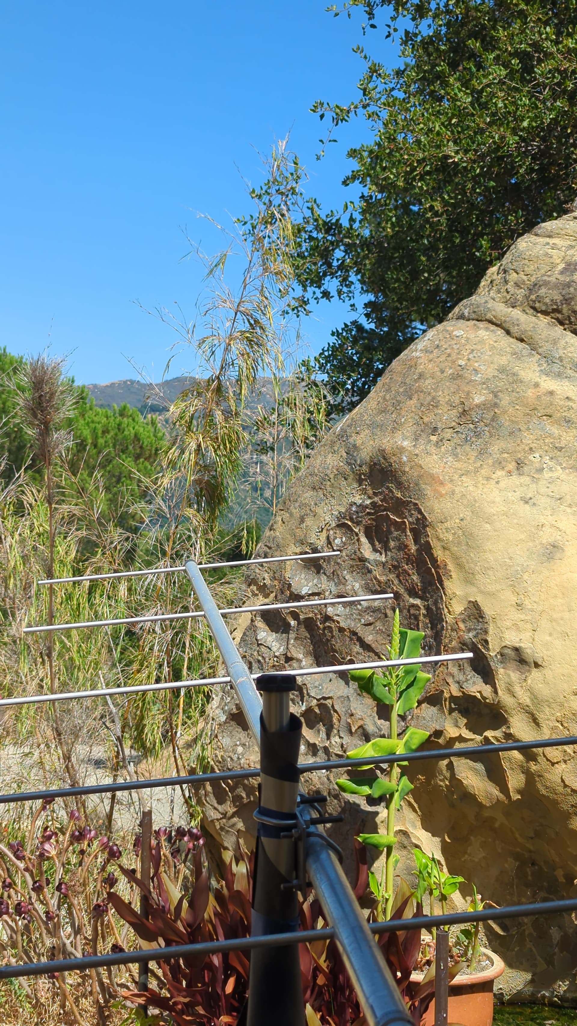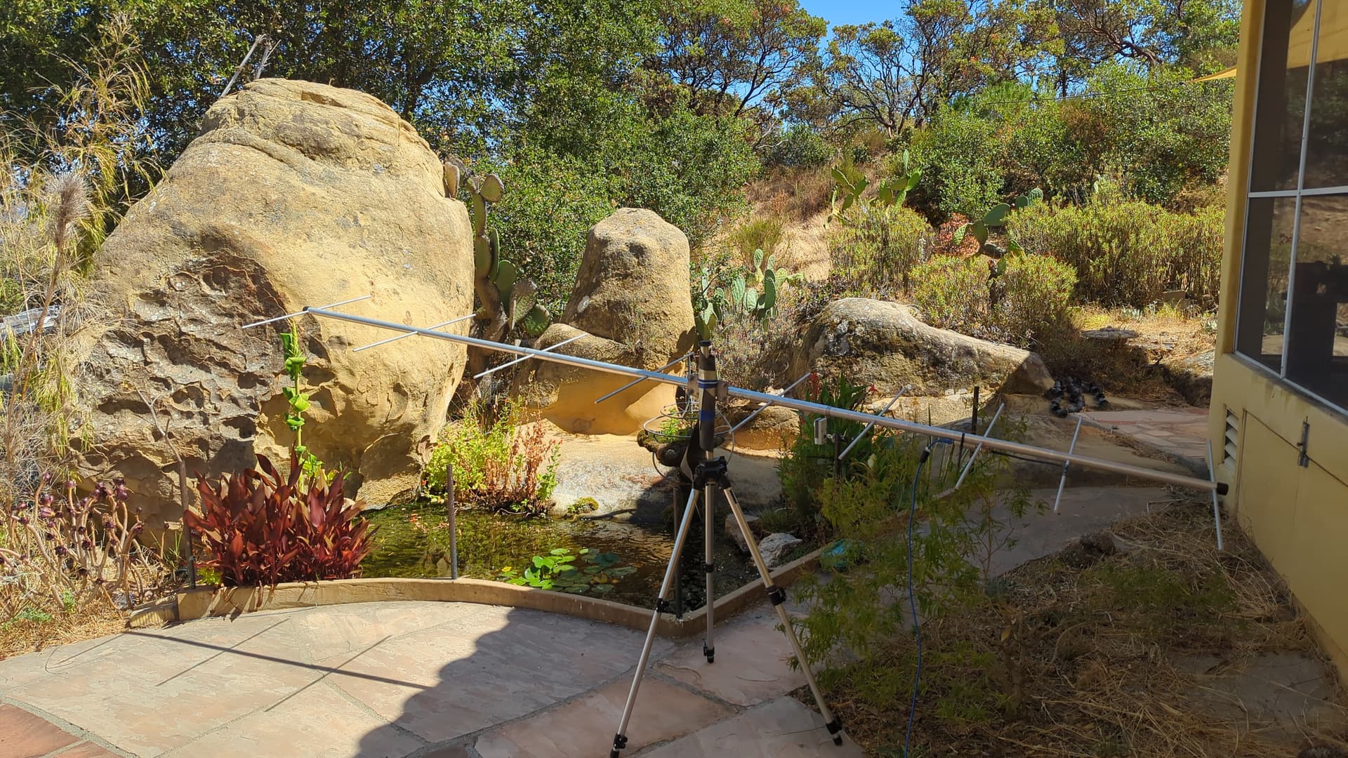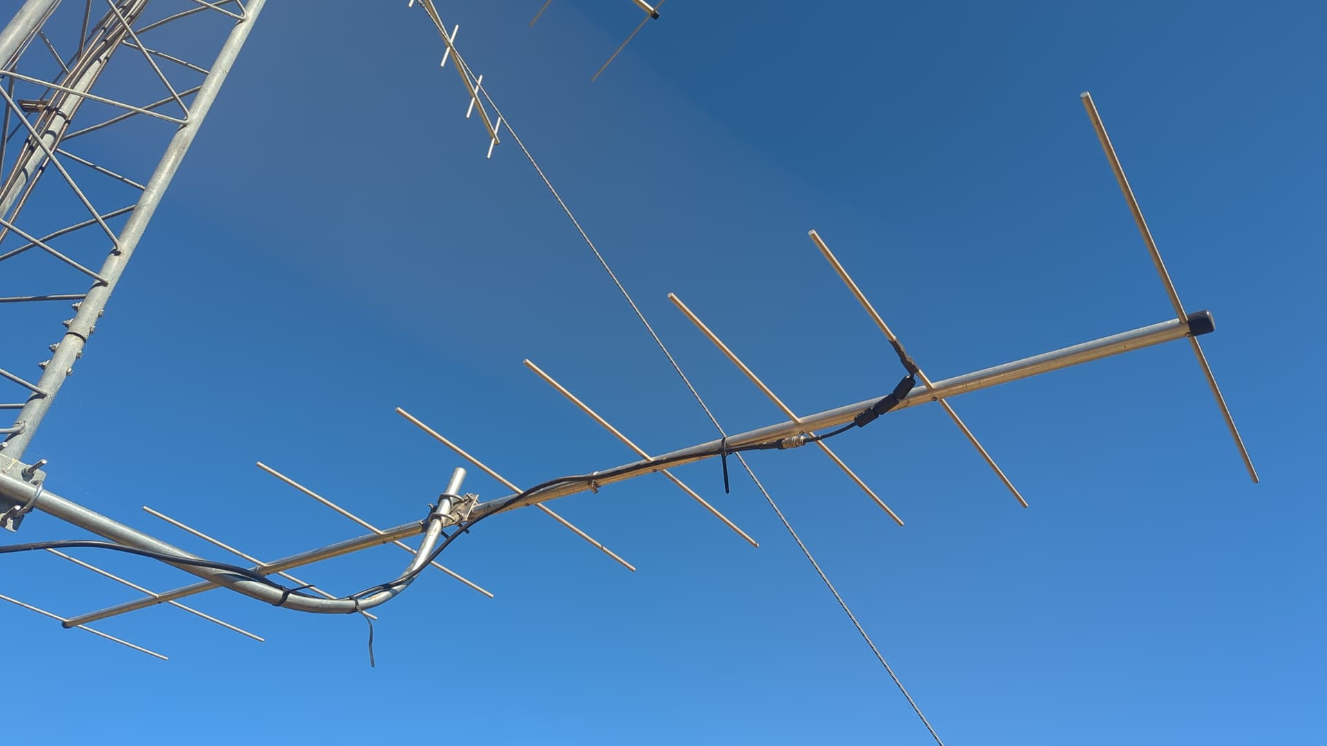 - 9-element Mapleleaf yagi, on tripod 3 meters off ground (and up-slope from tag)