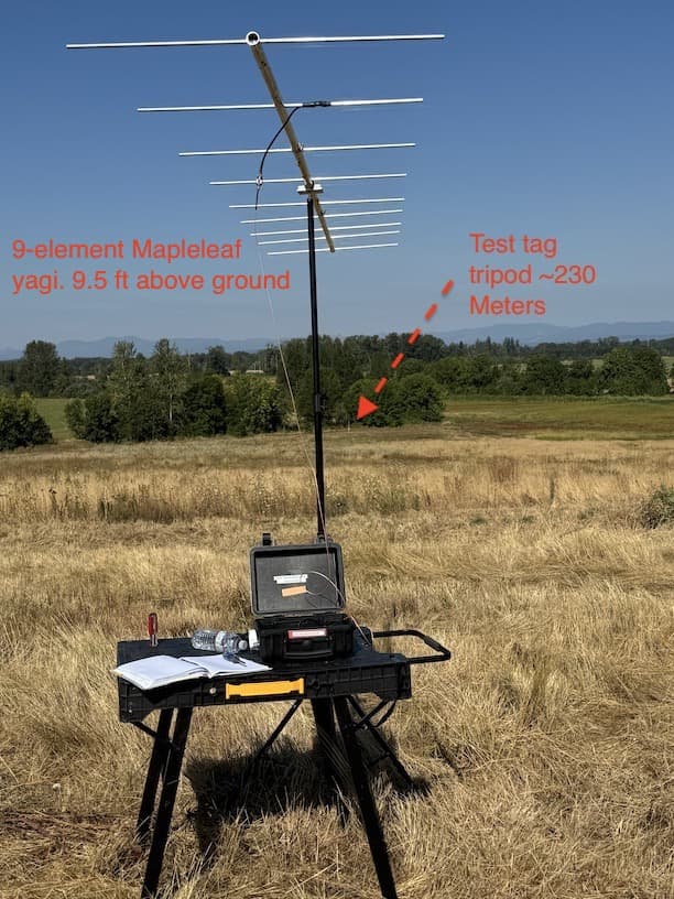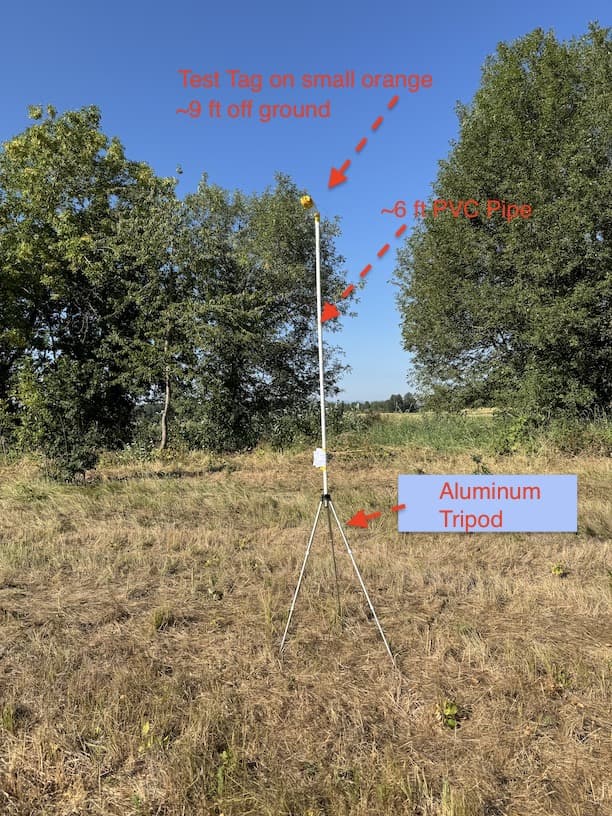 - Test tag ~230 meters away, ~3 meters off ground on plastic pole, taped to a piece of fruit (small orange).