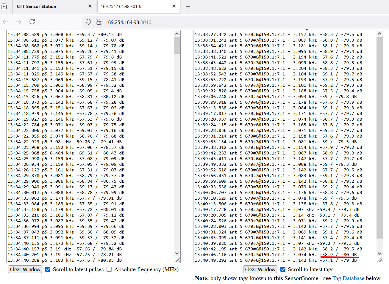 Attached are quick plots of the CTT station. (Remember… these are straight from the ‘production’ CTT station… no LNA-filter, or ferrites involved). Its just a different station and two different antennas listening to the same tag.