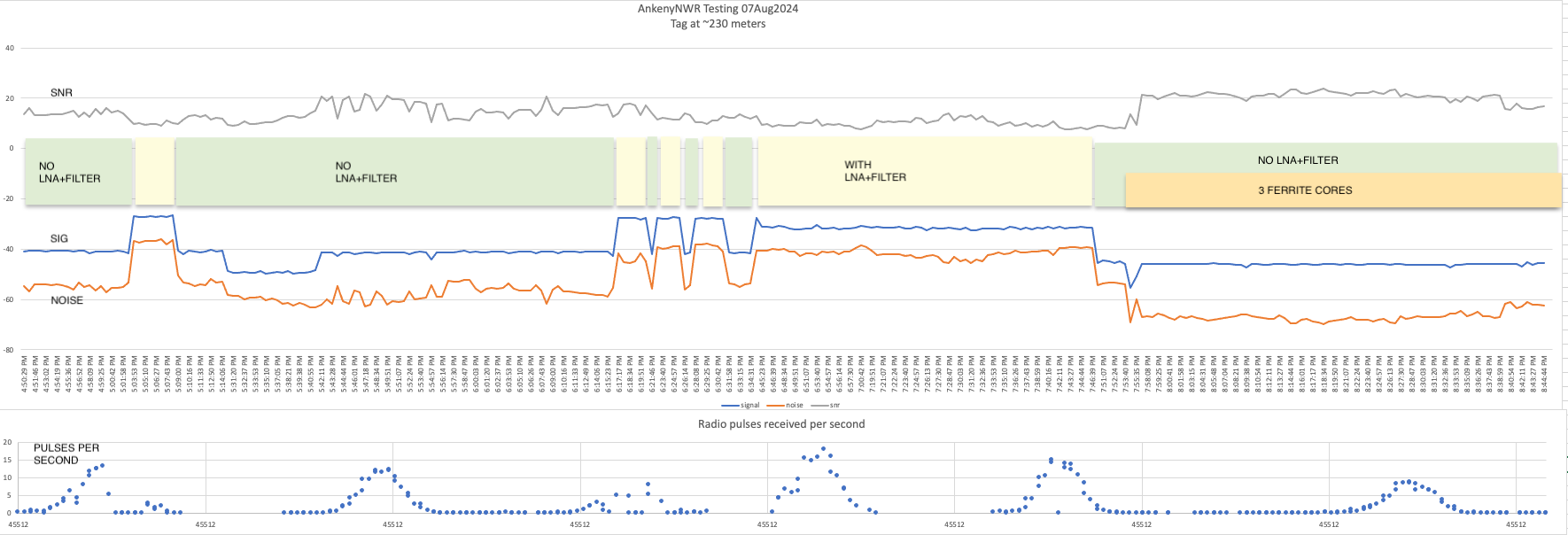 Attached are some results of my reccent 166 Mhz tag testing at Ankeny using an LNA-Filter on loan from Thorsten von Eicken and some clamp-on ferrite cores as suggested by Glenn Pollock (very active Motus tower installer and contributor with RF experience residing in Omaha NE)