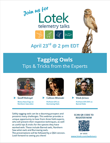Our next tagging webinar will be in two weeks, and includes deploying NanoTags on Saw-Whet Owls.