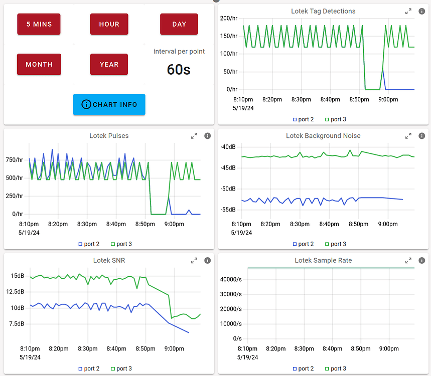 The lotek pulses and lotek tag detection graphs mirror these findings. In the first position both receivers got the same pulses and in the second position only the RTL-SDR got the pulses.